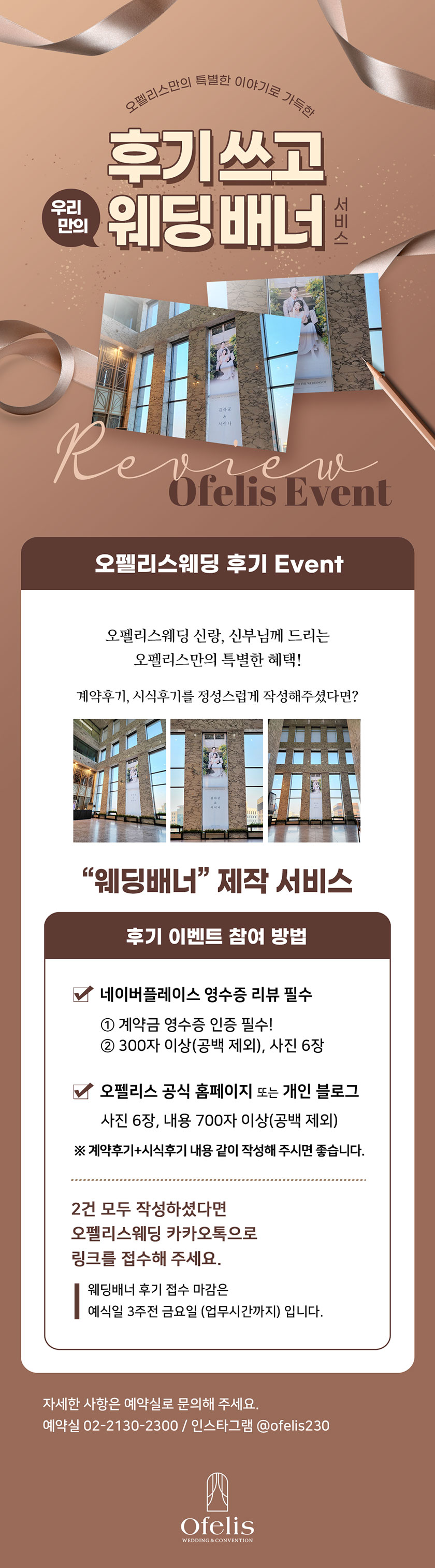 이벤트 상세 혜택 오펠리스웨딩 후기 이벤트 오펠리스만의 특별한 이벤트 웨딩배너!예식날 멋진 배너를 로비에 셋팅해드립니다~ 이벤트 기간 : 2025/10/16 ~ 계속 TEL : 02-2130-2300 이벤트 혜택 계약후기, 시식후기를 작성해 주시면신랑,신부님께 반응이 좋았던 웨딩배너를 선물로 드립니다.놓치지 마세요~ 이벤트 기간 2025/10/16 ~ 계속 목록 이전 이벤트 2025 공휴일 웨딩 할인 다음 이벤트 기업행사 & 파티대관 사전 예약